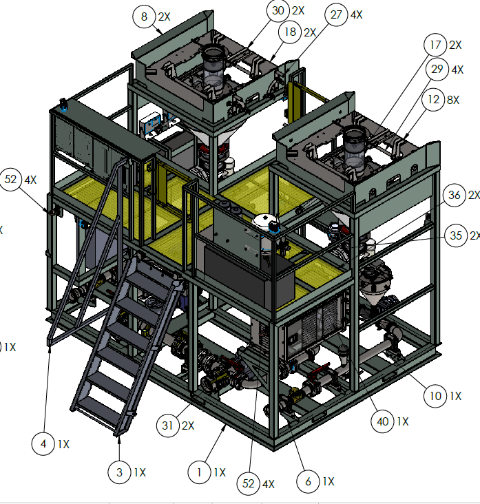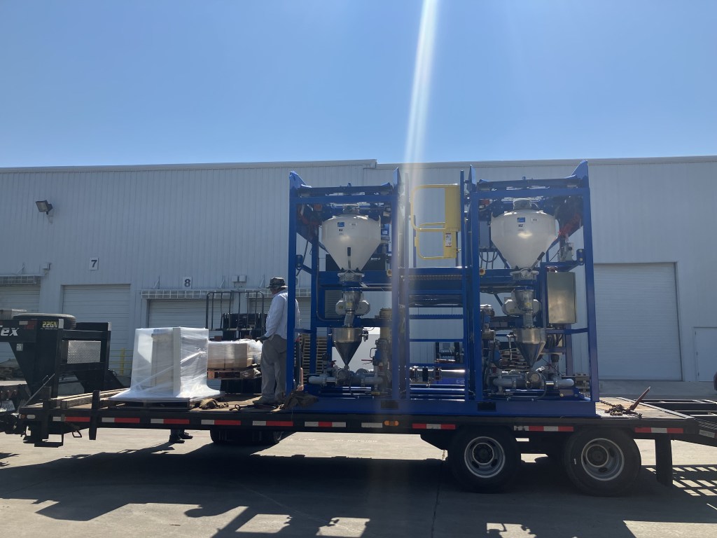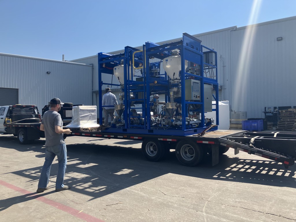 Oil field equipment which I redesigned for the customer. Mixes a friction reducer for fracking applications.